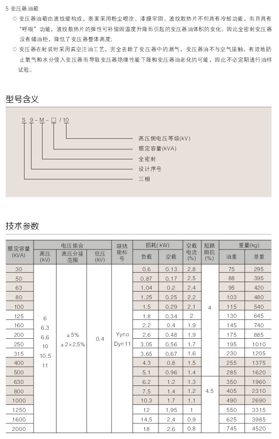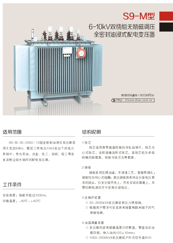 S9- M- 30~2000/ 10型全密封油浸式變壓器適.用于交流50Hz、額定工作電壓10kV及以下的電力系統中,作為石油、冶金、化工、紡織、輕工等企業及粉塵較大場所的配電變壓器。